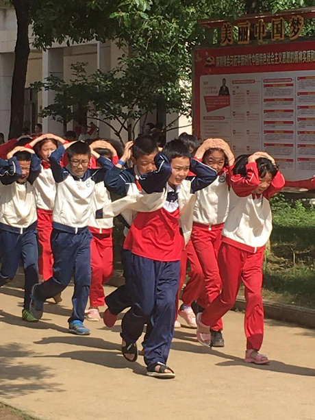 本次演练假设南昌县银河学校发生5.0级地震,针对这一事件开展应急演练。演练期间,工作人员到各教室分发防灾减灾宣传资料1000多份。伴随着学校广播防空警报的响起,拉开了全校防灾减灾应急疏散演练活动序幕,师生们就地在教室避震后,应急安全责任人老师组织学生们双手抱着头、弯着腰,井然有序地迅速撤出教室,前往紧急避难场所避难,短短几分钟内,参加演练的600余名学生顺利撤离到足球场,